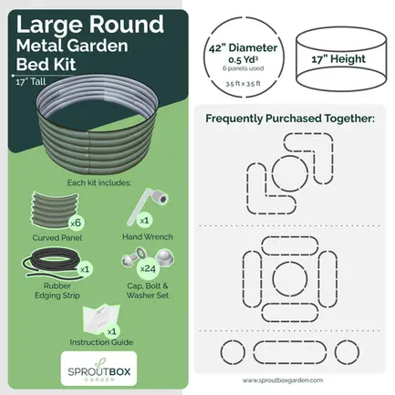 This is our largest circular garden kit at 42" in diameter. It's 17" tall and designed to far outlast a wood raised bed while still looking amazing. It offers plenty of growing room for vegetables or a great flower hub for those hard working pollinators. Made of the Top-Rated Specialized Steel for gardens and complimented by stainless steel hardware and commercial grade rubber edging. It's easy to understand why Canadians are trading in their wood gardens for a Sproutbox Garden.